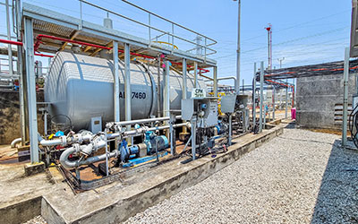 Les hydrocarbures liquides issus de la phase de séparation sont envoyés dans un bac pour une décantation suivi d’un pompage chez le client.
